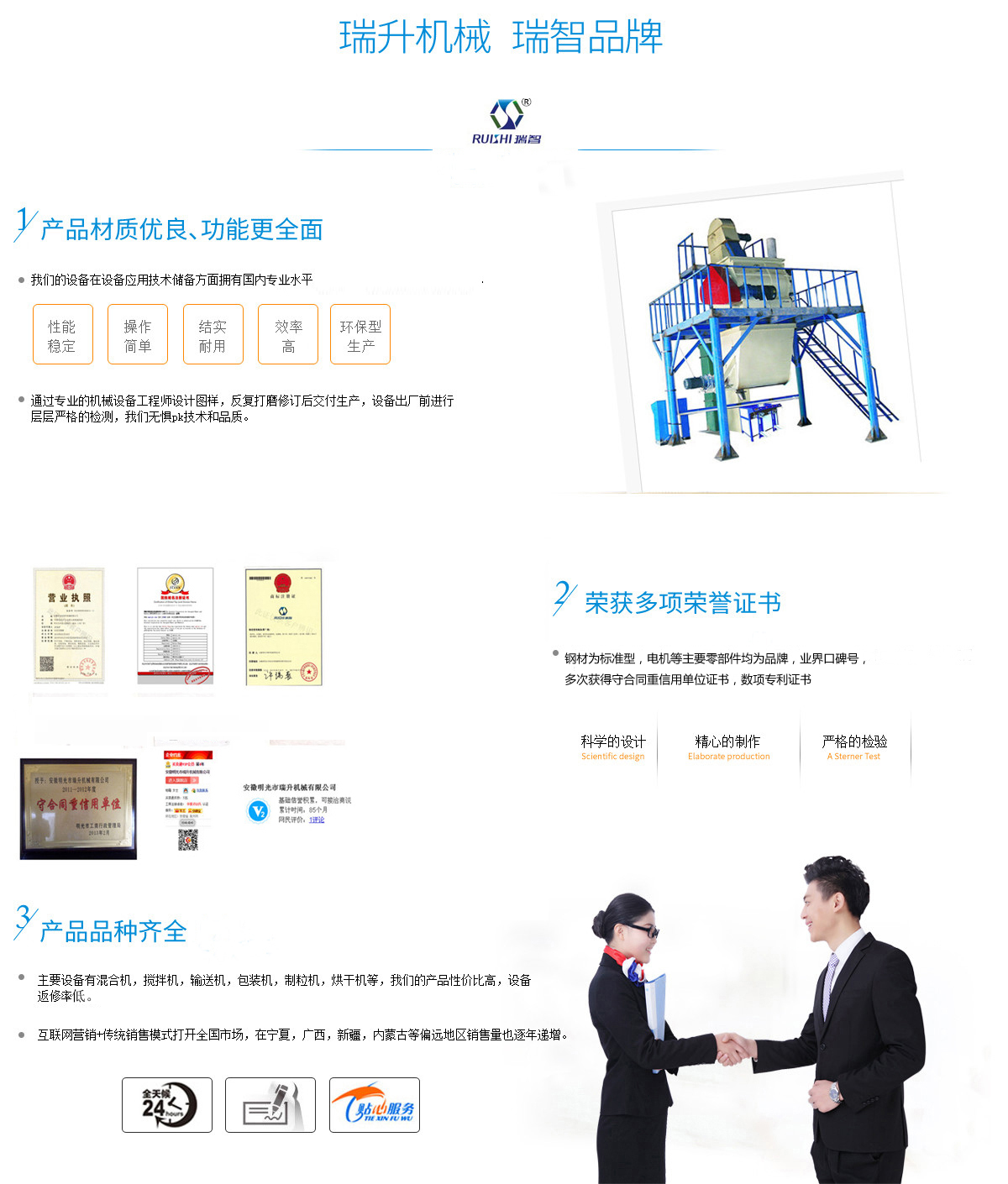 安徽瑞升機(jī)械制造有限公司坐落在明光市工業(yè)園區(qū),本公司產(chǎn)品主要用于粉料物質(zhì),顆粒物質(zhì)的混合、攪拌、輸送、包裝的自動(dòng)化生產(chǎn)設(shè)備。工廠占地面積為1萬(wàn)多平方現(xiàn)有6000平方米的生產(chǎn)車(chē)間和各類加工檢測(cè)設(shè)備,具備產(chǎn)品開(kāi)發(fā)、研制、設(shè)計(jì)、生產(chǎn)、試驗(yàn)、倉(cāng)儲(chǔ)運(yùn)輸?shù)饶芰Γ梢陨a(chǎn)多種規(guī)格、多種非標(biāo)定制的產(chǎn)品,并有多項(xiàng)技術(shù)獲得國(guó)家專利,擁有自主進(jìn)出口權(quán),公司憑借優(yōu)良的技術(shù)、先進(jìn)的工藝和科學(xué)的管理理念,所生產(chǎn)的產(chǎn)品已暢銷全國(guó)各地,部分產(chǎn)品已進(jìn)入馬耳他、印度尼西亞、韓國(guó)、羅馬尼亞、沙特阿拉伯、馬來(lái)西亞、印度、巴基斯坦、等國(guó)家和地區(qū),受到國(guó)內(nèi)外客戶的高度認(rèn)可和信賴。 本公司獲得守合同重信用單位證書(shū),對(duì)原材料的采購(gòu)極為細(xì)致,鋼材為標(biāo)準(zhǔn)型,電機(jī)等主要零部件均為品牌,數(shù)項(xiàng)專利證書(shū)。技術(shù)方面我司擁有一支國(guó)內(nèi)的技術(shù)和管理團(tuán)隊(duì),在機(jī)械設(shè)備應(yīng)用...公司資質(zhì)榮譽(yù)